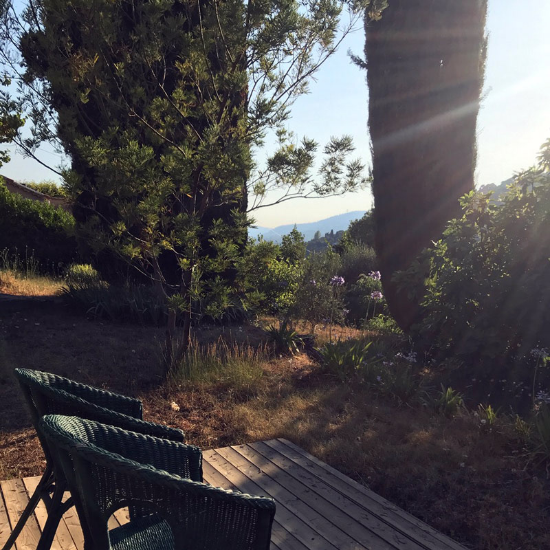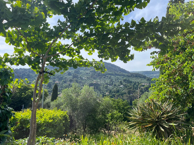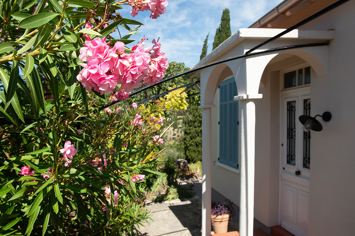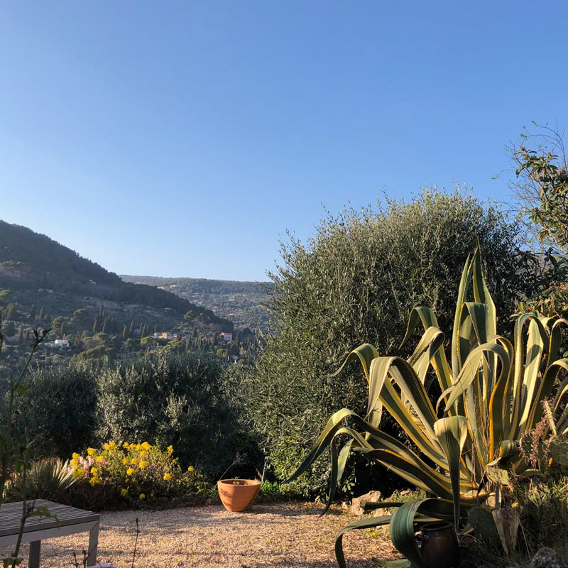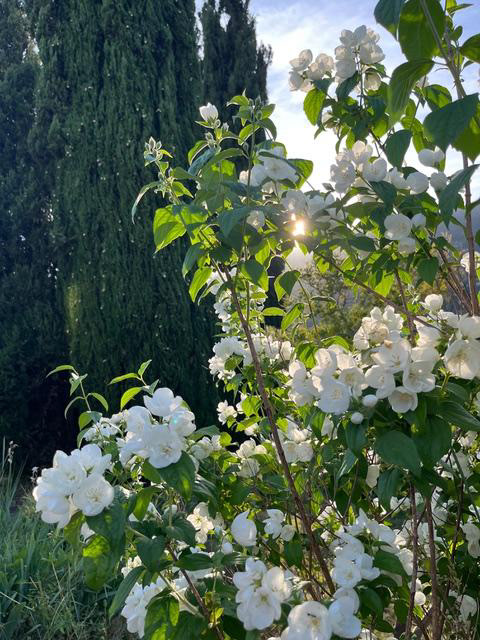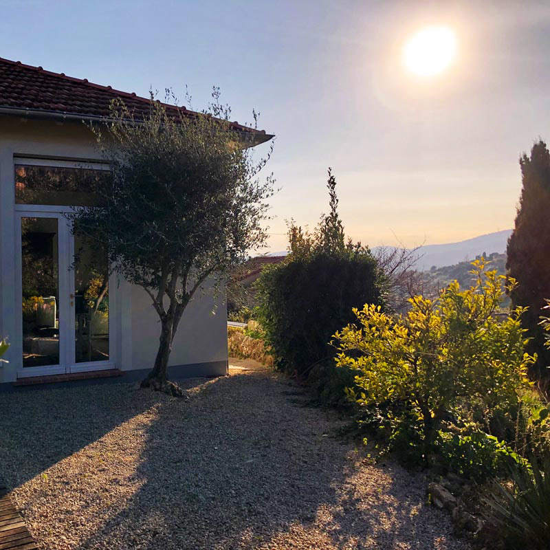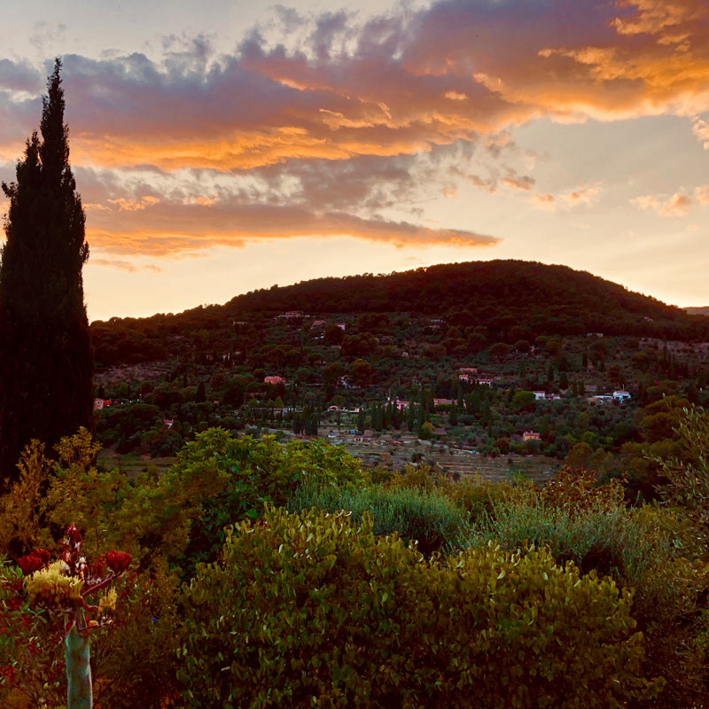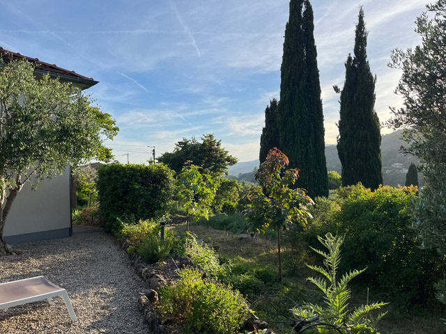 In de terrassentuin, waar stapelmuren het landschap ritme geven, staan drie hoge cipressen als herkenningspunt. Ze zijn niet alleen het beeldmerk van onze website, maar ook een vertrouwd gezicht in de omgeving – markant, bijna iconisch.